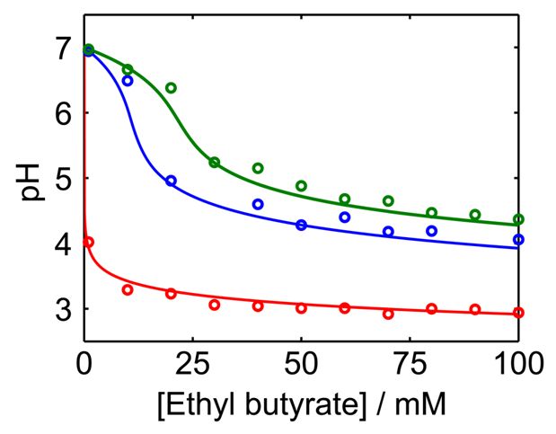 ![]() Measured pH values at the reaction time t = 120 min, shown vs. the initial substrate concentration, for different amounts of HEPES. Red (bottom) symbols/curve correspond to [HEPES] = 0, blue (middle): [HEPES] =50 mM, green (top): [HEPES] = 100 mM. The circular symbols are the actual pH values, whereas the solid curves are the theoretical model fits. (These curves were shown in the inset in the figure above, rescaled in terms of the logic-range variables). |