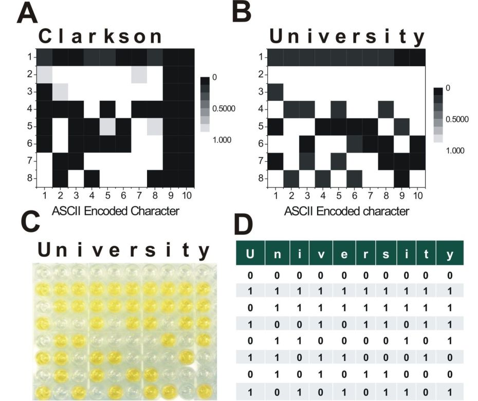 (above) Words encoded using ASCII character codes upon application of different set-reset signals (H2O2-NADH, respectively) to the multi-well flip-flop system composed of HRP and Diaph as the biocatalysts and K4[Fe(CN)6] as the redox species. Optical read out of the words Clarkson (A) and University (B) at 415 nm. Color photo of the multi-well reactor with the encoded word University (C) and the respective ASCII codes for the used characters (D). ![]() It should be noted that an undergraduate student Kevin MacVittie participated in the project working in a team of graduate students/postdocs. |