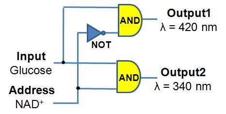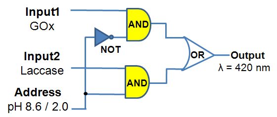 (above) The electronic equivalent circuitry of the 2-to-1 multiplexer based on the enzyme catalyzed reactions. |