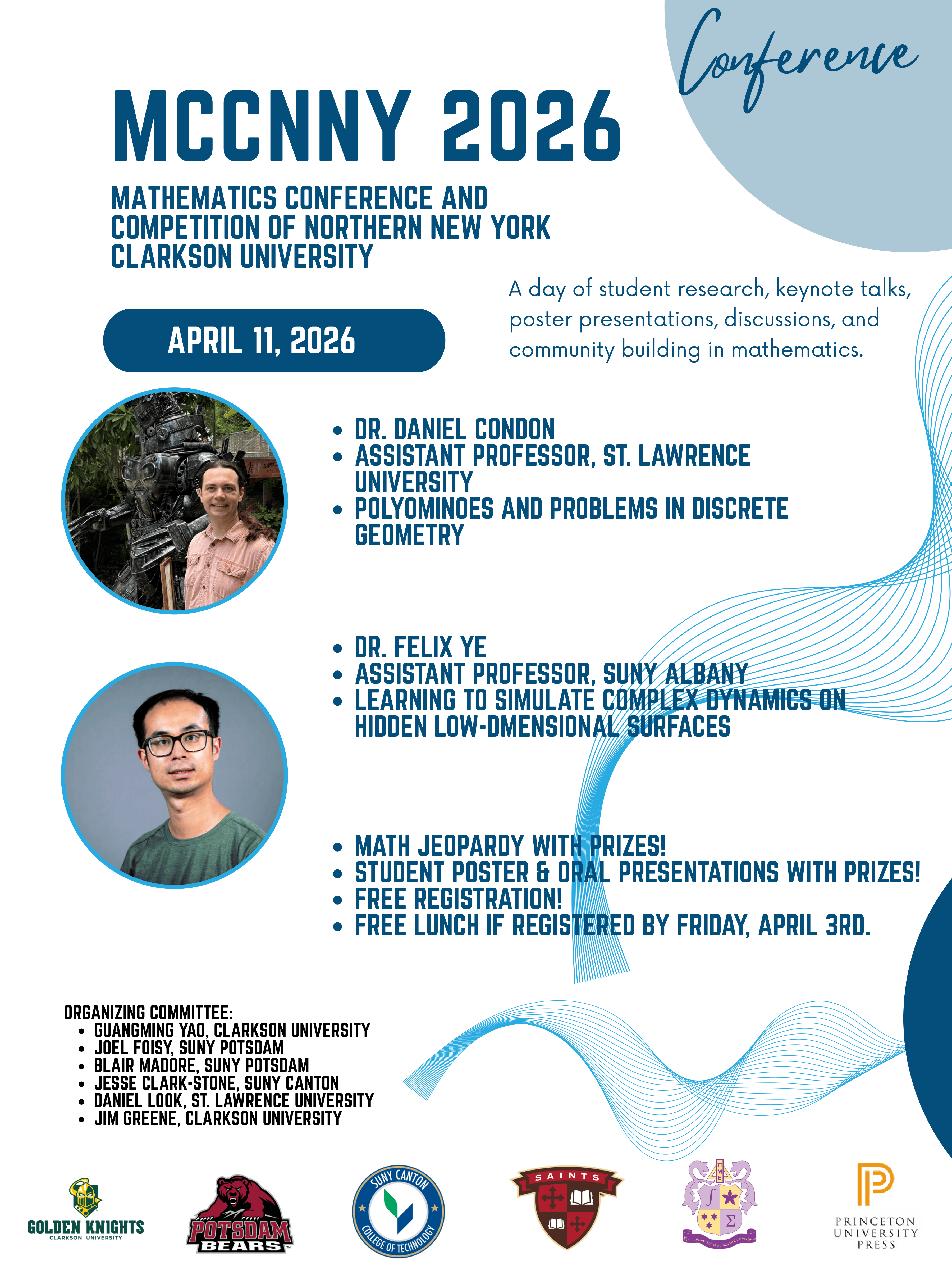 This conference is a student-driven research oral and poster presentations and panel discussions. The purpose of the conference is to foster collaborations within the Associated Colleges of the St. Lawrence Valley, provide career, REU and graduate school information, and to celebrate the success of mathematics students. Please encourage your faculty and students to participate in MCCNNY 2026.